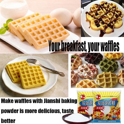 1.Preheat waffle iron. Beat eggs in large bowl with hand beater until fluffy. Beat in flour, milk, vegetable oil, sugar, Jianshi Baking Powder, salt and vanilla, just until smooth.